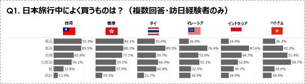 今回から調査が始まったベトナムは、「化粧品・衣類・食品・薬品」の順で、どちらかというとポピュラーな商品が選ばれています。それに比べて、香港や台湾では「薬品」が最も多く、自分用はもちろん家族や友人に頼まれて、日本製のニキビ薬や整腸剤など、指定の医薬品を購入しているケースが多いようです。