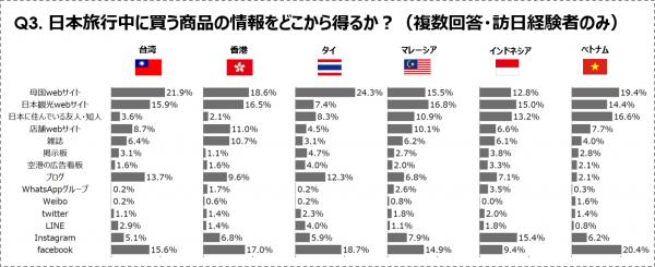 「母国のwebサイト」を一番に上げたのは香港・台湾・タイ。マレーシアは「日本の観光webサイト」、インドネシアはInstagram、ベトナムはfacebookが1番になっています。興味深いのは、香港と台湾以外の国は「日本に住んでいる友人・知人」から情報を得ている人も多いこと。口コミ情報が行き交っているようです。