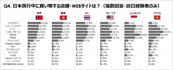 先にご紹介した通り、香港・台湾の人がよく買うものは医薬品でした。それにリンクして、買い物する店舗の1位もドラッグストア。そして、コンビニ、スーパー、ショッピングモールと続きます。一方、今回から初めてデータをご紹介するベトナムは、ショッピングモールや商店街、スーパーの順で多く、コスパがよく訪れやすい場所を選んでいる印象があります。