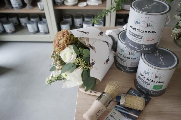 (写真:TWSAstudioオリジナル包装紙でラッピングされたオリジナルブーケとイギリスのペイントブランドアニースローン)