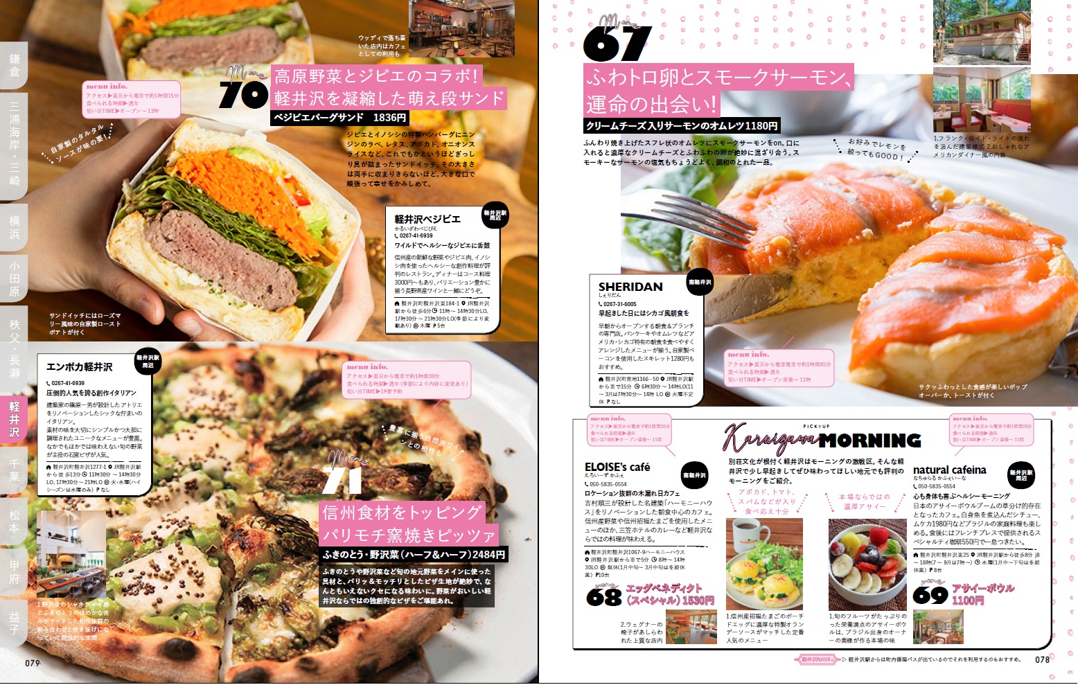 鎌倉や三崎のほか、横浜、長瀞、軽井沢、甲府、松本などのエリア別に、写真満載でグルメを紹介。メニュー数が多いので、同じエリアでも何度も使えるのが魅力的。東京からのアクセス時間の目安や、比較的行列が少ない狙い目タイムなども掲載しているので、プランニングに役立ちます。