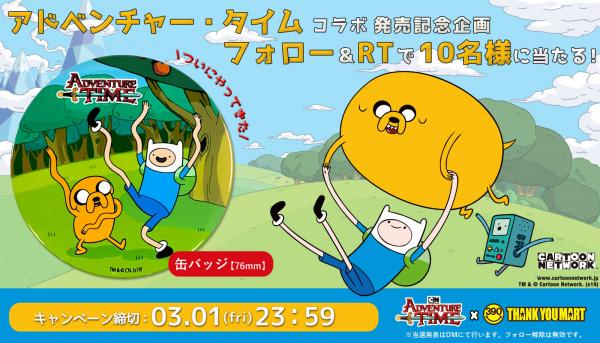 《アドベンチャー・タイム×サンキューマート》コラボ商品発売を記念して、サンキューマートツイッター公式アカウントでは、プレゼント企画を開催。2019年春発売予定のコラボ缶バッジ(76mm)を10名様に先行プレゼントいたします。