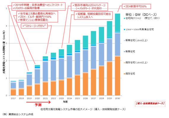 上記以外にも、住宅用太陽光発電システム関連市場として、集合住宅向け(マンション・アパート向け)、ルーフトップ以外からの住宅向け電力供給専門の太陽光発電システム(TPOモデルなどを想定、野立てタイプなど)市場も合わせて検討しています。ここまで含めた住宅関連市場全体では、2030年度には現状成長ケースで2.8GW/年、導入・技術開発加速ケースで4.7GW/年まで拡大する可能性があります。