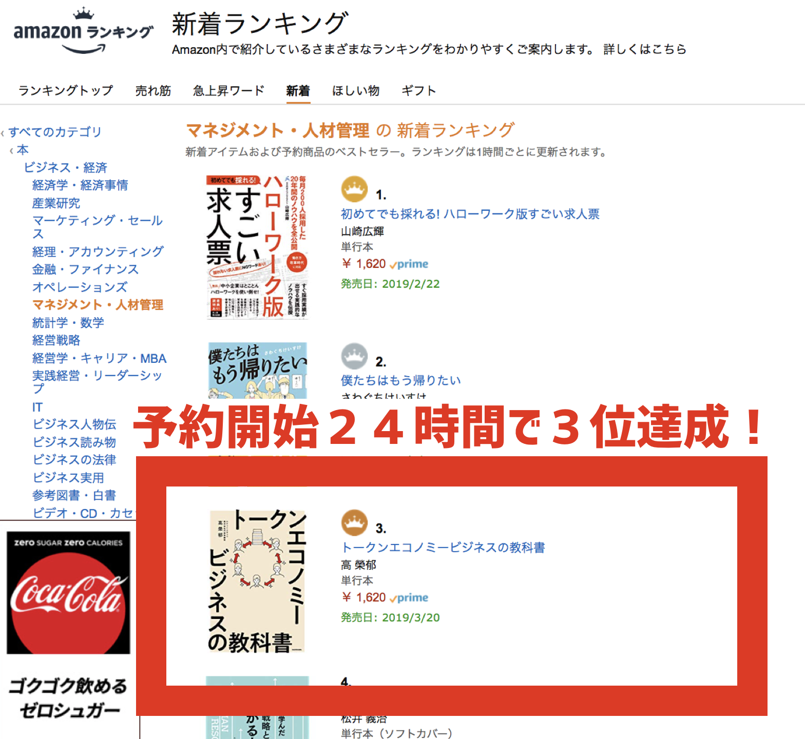 電子書籍配信サービスやブロックチェーン事業を手がけるロケットスタッフ株式会社(本社:東京都渋谷区、代表取締役:高 榮郁、以下「ロケットスタッフ」 )は、トークンエコノミービジネスをわかりやすく説明した「トークンエコノミービジネスの教科書」がAmazonの予約販売開始(2018年2月19日)から約24時間以内で新着ランキング(ビジネス・契約-マネジメント・人材管理カテゴリ部分 )で3位を達成したことをお知らせいたします。