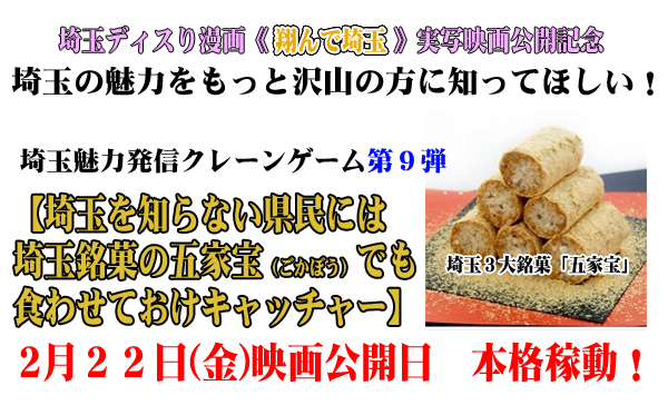 「埼玉県民にはそこらへんの草でも食わせておけ!」など強烈なセリフで話題の埼玉ディスり漫画 《翔んで埼玉》 の実写映画が2月22日(金)から公開されます。それに伴い、埼玉が今、全国的に注目を浴びています。埼玉県行田市にある当店でも、実写映画公開を記念して、もっと沢山の方に埼玉の魅力を知ってもらおうと、あまり知られていない埼玉3大銘菓の中の1つ、五家宝を景品にした【埼玉魅力発信クレーンゲーム】第9弾を登場させました。作中の強烈なセリフにちなんで「埼玉を知らない県民には埼玉銘菓の五家宝でも食わせておけキャッチャー」と命名しました。この機会に、埼玉3大銘菓の五家宝を沢山の方に知って頂ければと思います。
