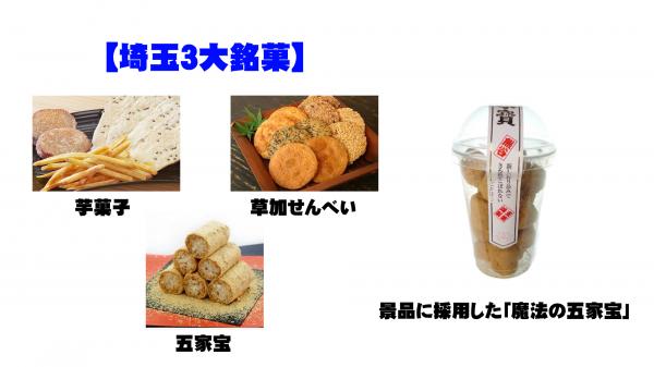 埼玉3大銘菓とは、川越名物の「芋菓子」、草加名物の「草加せんべい」、熊谷名物の「五家宝」と言われています(※諸説あります)。今回は景品に、埼玉3大銘菓の中でも熊谷名物の五家宝を選びました。五家宝とは、もち米ときな粉を糖蜜にからめ、きな粉をまぶして仕上げた、食べたときにもっちりとした食感がおいしい銘菓です。五家宝の特徴とも言えるきな粉は食べるときにこぼれてしまい、食べにくいという点があります。そこで、きな粉がこぼれにくく、初めて食べる方でも食べやすい、“五家宝本舗 埼玉製菓”さんの「魔法の五家宝」を景品に採用しました。