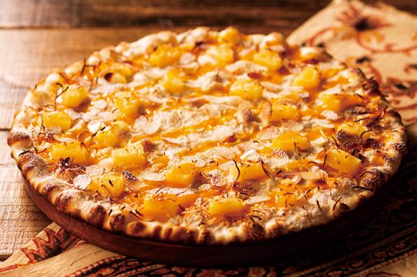 パイナップルとマンゴーソースに香ばしいアーモンドスライスがアクセント。スパイシーなピザやスパゲッティの後にココナッツクリームのデザートピザを。
