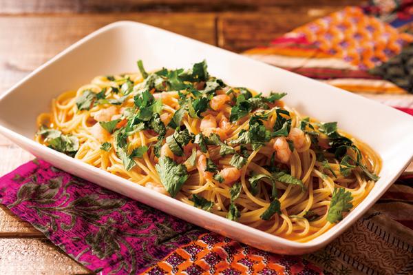タイ料理のトムヤムクンスープとスパゲッティのコラボレーション。旬のパクチーも一緒に。