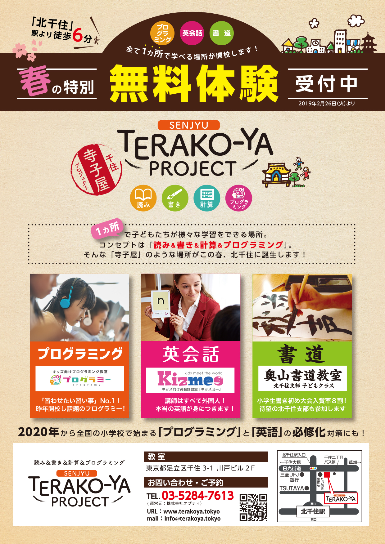 昨年北千住にプログラミング教室「プログラミー」を開校させ200名以上を無料体験会で動員した株式会社オプティは、2019年4月より1ヶ所で3つの習い事を学べる教室を「TERAKO-YA PROJECT(http://terakoya.tokyo)」として新たに開校します。