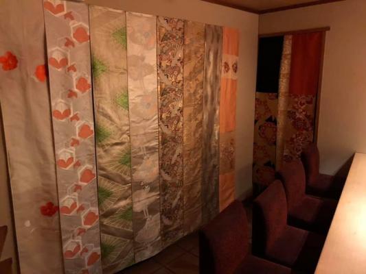 白木のカウンターを際立てる和空間の店内の装飾はすべて帯を使用しています。