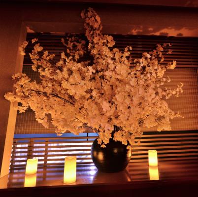 エレベーターを降りた瞬間、帯の垂れ幕がお迎えし、暖簾、背後含め30筋の帯が寛ぎの時間を共有します。