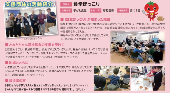 2017年に、地域の一員として、子どもの困窮支援を主とする地域の福祉活動を継続的に支援することを目的とした「とまとちゃん福祉基金」を設立。「とまとちゃん福祉基金」は組合員による書き損じはがき募金、また組合員やお取引先より寄せられた寄付金(2019年1月末現在3,940万円)により支えられています。