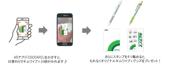 「キムワイプ(R)」とは、産業用の紙ワイパーとして、日本をはじめ世界中の研究室・実験室・工場・病院において愛用されているベストセラー商品です。当キャンペーンの期間中、ARアプリ「COCOAR2」をダウンロードしたスマートフォンを、キムワイプ(R)S-200の小箱の側面にかざすと、日替わりのキムワイプ(R)川柳(全31種類)が出現します。さらに、モバイルスタンプラリーと連動しており、1週間に一度1ポイントが貰える仕組みとなっております。4ポイント貯めると、もれなくキムワイプ(R)グッズ1点がプレゼントされます。