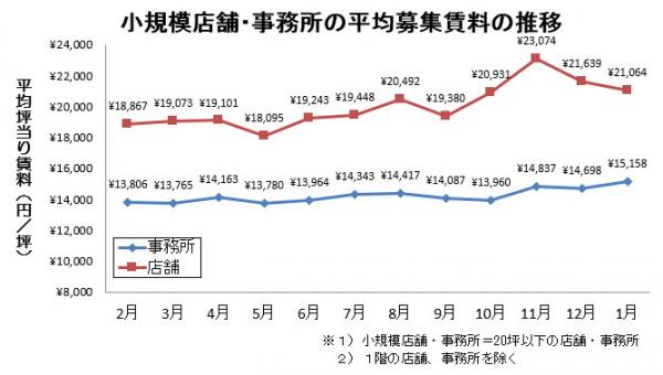 小規模店舗(20坪以下)の1月度平均募集賃料は、前月から2.7%下降しました。