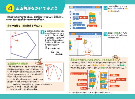 正多角形の描画など、学校の勉強を先取りできるだけではなく、ゲーム作りにも挑戦でき、お子さまの興味を引きながら基礎を順を追ってしっかりと学ぶことができます。全てのページがフリガナつきでお子さまひとりでも学習できます。