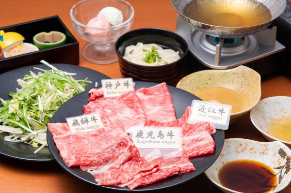 『しゃぶしゃぶ 浅草 和み』は基本的にしゃぶしゃぶのコースメニューしか存在しません。そしてしゃぶしゃぶはすべて最高級銘柄和牛の肩ロースのみを提供しています。世界に誇る和牛界のトップ、神戸牛はもとより、少数飼育でその芸術的なサシが特徴的な飛騨牛、日本三大和牛に数えられる、400年超の歴史を持つ近江牛、そして和牛生産量日本一、力強い肉質が特徴の鹿児島牛の4種類だ。どれも和牛界における主役たちです。