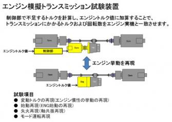 トランスミッションの試験装置として、駆動ダイナモメータでエンジン実機を模擬し、供試体となるトランスミッションにトルクをかける試験装置が使用されています。