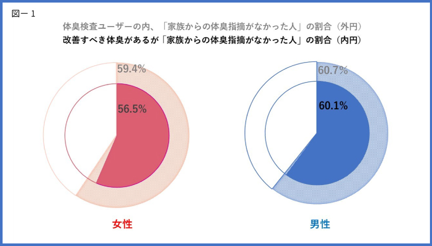 体臭検査と体臭改善策提案を行う「体臭クリーニング(株式会社ベネフィット-イオン運営)」では、保有する日本人1500人の体臭データを分析し、そのうちの「改善すべき体臭を持つ1259人」に於いて、自身が家族から体臭に関する指摘を受けたことが無いという人の比率が58.1%にものぼるという結論を得ました。【図-1参照】