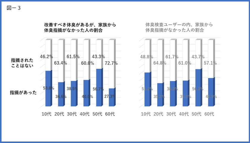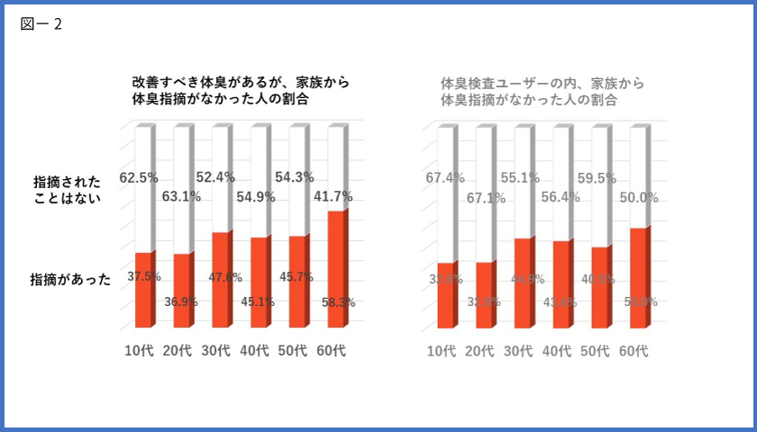 性別年代別に見ると女性の方が、体臭の有無の家族指摘正解率が低く、尚且つ、若い世代にその傾向が顕著になります。これは上記の感覚的要因の他に、「若い女の子だから傷つけたくない」「体臭に気付いているからこそ言いにくい」という、指摘する家族側の心理が働いて、低い数値となって表れていると予想されます【図-2参照】