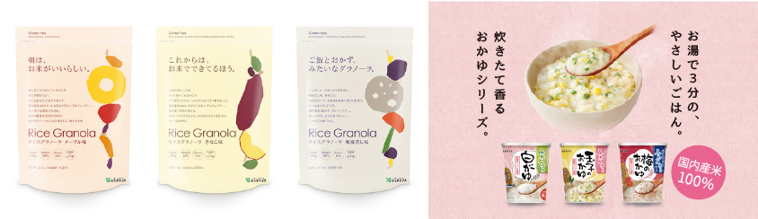 ■商品紹介: 「ライスグラノーラ」:国内産100%のお米(玄米)でつくったグルテンフリー商品です。