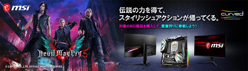 2019年3月18日 - Micro-Star International Co., Ltd. 台湾・新北市 - マザーボードの設計で世界をリードするMicro-Star International(MSI)は、3月18日~5月12日の期間中、Amazon.co.jp、価格.comおよびエディオンのオンラインショップにおいて、対象のマザーボードまたはGAMINGモニターをご購入され、その使用した感想をご投稿いただいたユーザーに、株式会社カプコンの人気アクションゲーム「デビル メイ クライ」シリーズ最新作「デビル メイ クライ 5」のゲームコードをプレゼントする「MSI×Devil May Cry 5キャンペーン」を実施いたします。なお、本キャンペーンは、キャンペーン期間中であっても予定数量に達し次第終了いたします。ゲームコードの引換期間は、2019年9月7日までです。