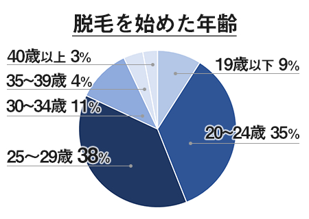 脱毛を始めた年齢についての調査では、35%の人が20代前半、38%の人が20代後半に脱毛をスタートさせているという結果となりました。
