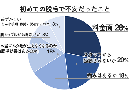 また、「スタッフから勧誘されないか(20%)」「痛みはあるか(18%)」「効果はあるのか(18%)」についても、初めて脱毛する時に多くの人が不安を抱えていることがうかがえます。