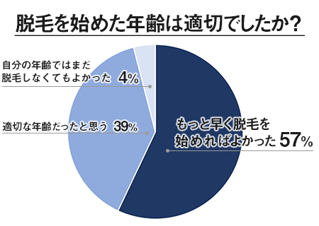 また、「Q.脱毛を始めた年齢は適切でしたか?」という質問では、57%の人が「もっと早く脱毛を始めれば良かった」と答えています。