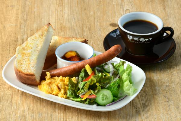 B セット(コーヒー、パン、サラダ、スクランブルエッグ、粗挽きロングウィンナー、副菜) 580円