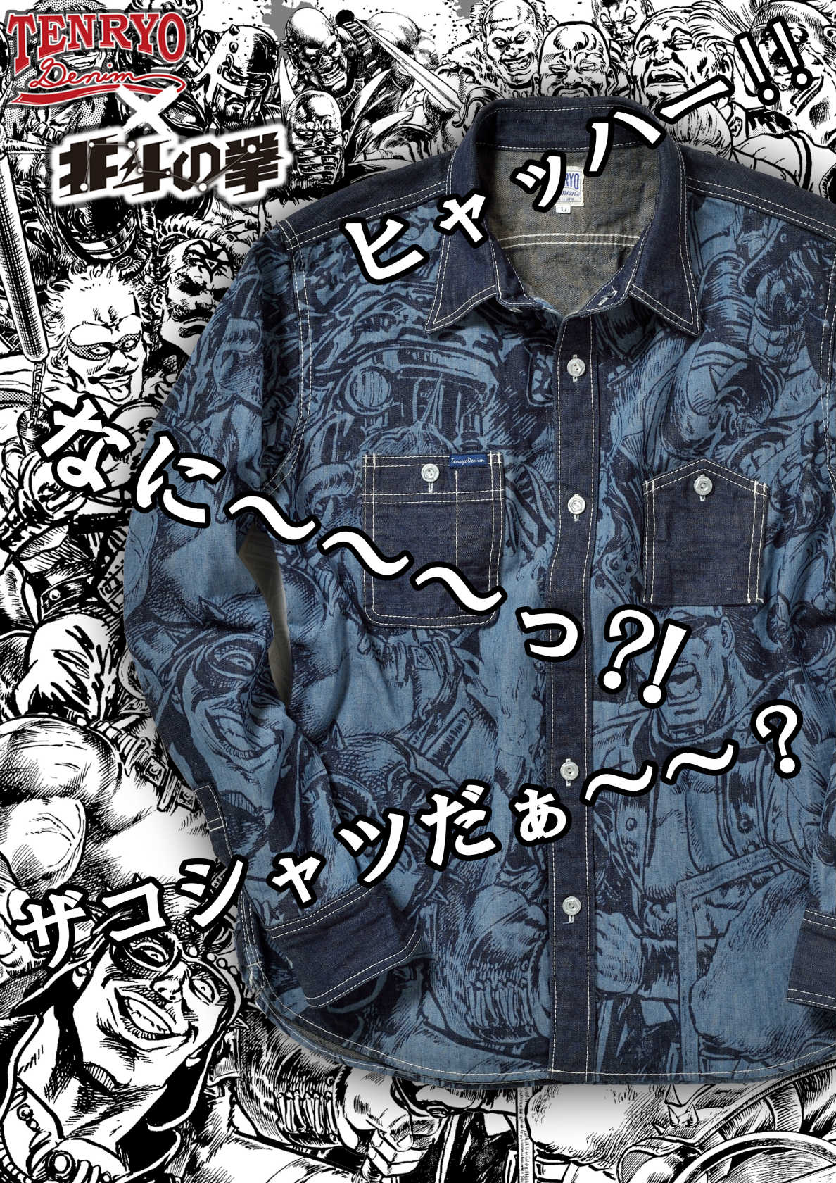 漢たちの壮絶な運命を描いた不朽の名作『北斗の拳』の名脇役であるザコキャラクターを全面にデザインされたインパクト溢れるシャツをデニムの本場、岡山の技術で弊社のブランド『倉敷天領デニム』とのコラボレーションを実現しました。