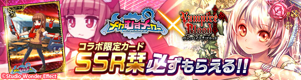 ソーシャルゲーム開発を行う株式会社テンダ(本社/東京都豊島区、 代表取締役社長/中村繁貴)は、「Mobage(モバゲー)」など各ゲームプラットフォームで提供中のソーシャルゲーム『ヴァンパイア†ブラッド』にて、3月28日(木)より有限会社スタジオワンダーエフェクト(本社/大阪府八尾市、代表取締役/慶島辰行)が提供中のソーシャルゲーム『メカむすメーカー』とのコラボイベントを開催することをお知らせします。