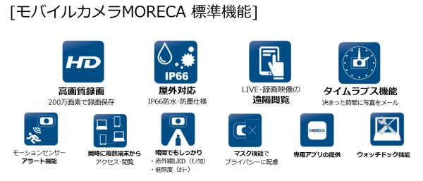 モバイルカメラ「MORECA」は、LTE(4G)/3G通信モジュール及び録画機能を搭載したモバイルの監視・防犯カメラです。従来の「MORECA」は電源がある場所への簡単設置が可能ですが、モバイルソーラーカメラは、ソーラーパネルより電源供給するため電源設備も不要となり、より簡単に設置することが可能です。
