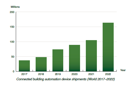 スウェーデンの調査会社ベルグインサイト社(Berg Insight)の「世界の商業ビル自動化(ビルオートメーション)市場」は、世界のスマートビル市場に関する最新情報を提供している。5年間の市場予測と専門家のコメントを記載している。スマートビル市場でモバイル産業のビジネスチャンスを最大限生かす道筋を模索している。ベルグインサイト社は、世界のビルオートメーションシステムの出荷数は、2018年の12億から年平均成長率(CAGR)21.4%で成長して、2022年に27億に達するだろうと予測している。急成長する世界のビル自動化市場に関する全方位的な概観を提供している。