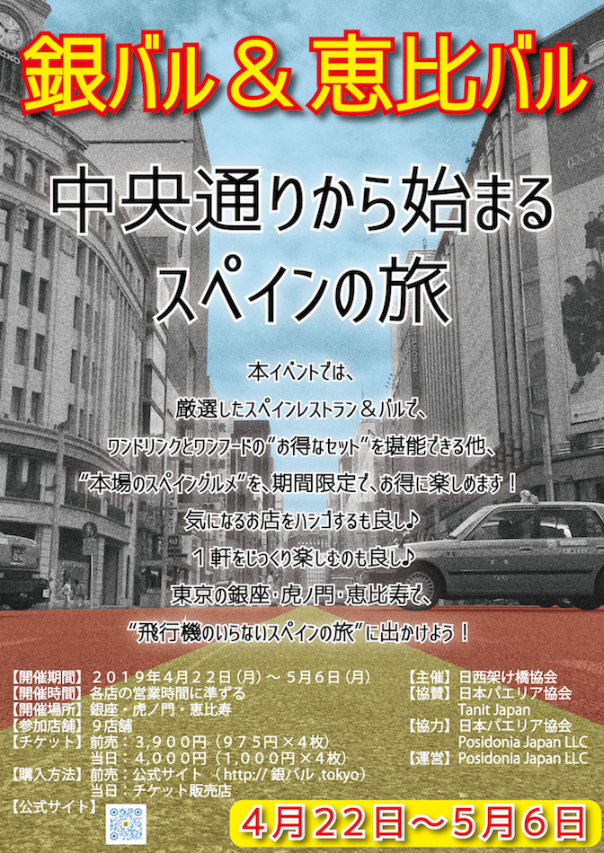 日本とスペインの文化交流を図り、両国の架け橋になるべく活動する、日西架け橋協会(所在:東京都港区、会長:エクトル・ペレス)は、2019年4月22日~5月6日までの約2週間に渡り、お得にスペイン料理とお酒を堪能できるグルメイベント、『銀バル&恵比バル』を、東京・銀座、恵比寿にて開催いたします。