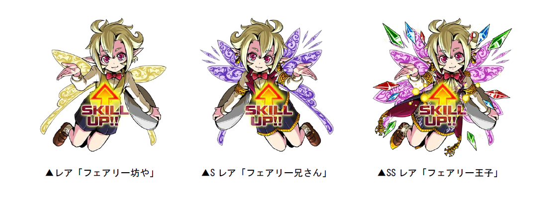本ダンジョンには、限定の強化素材、男の子版「スキルフェアリー」が登場します。男の子版「スキルフェアリー」は、“経験値アップ”と“スキルレベルアップ上昇確率”の効果があります。