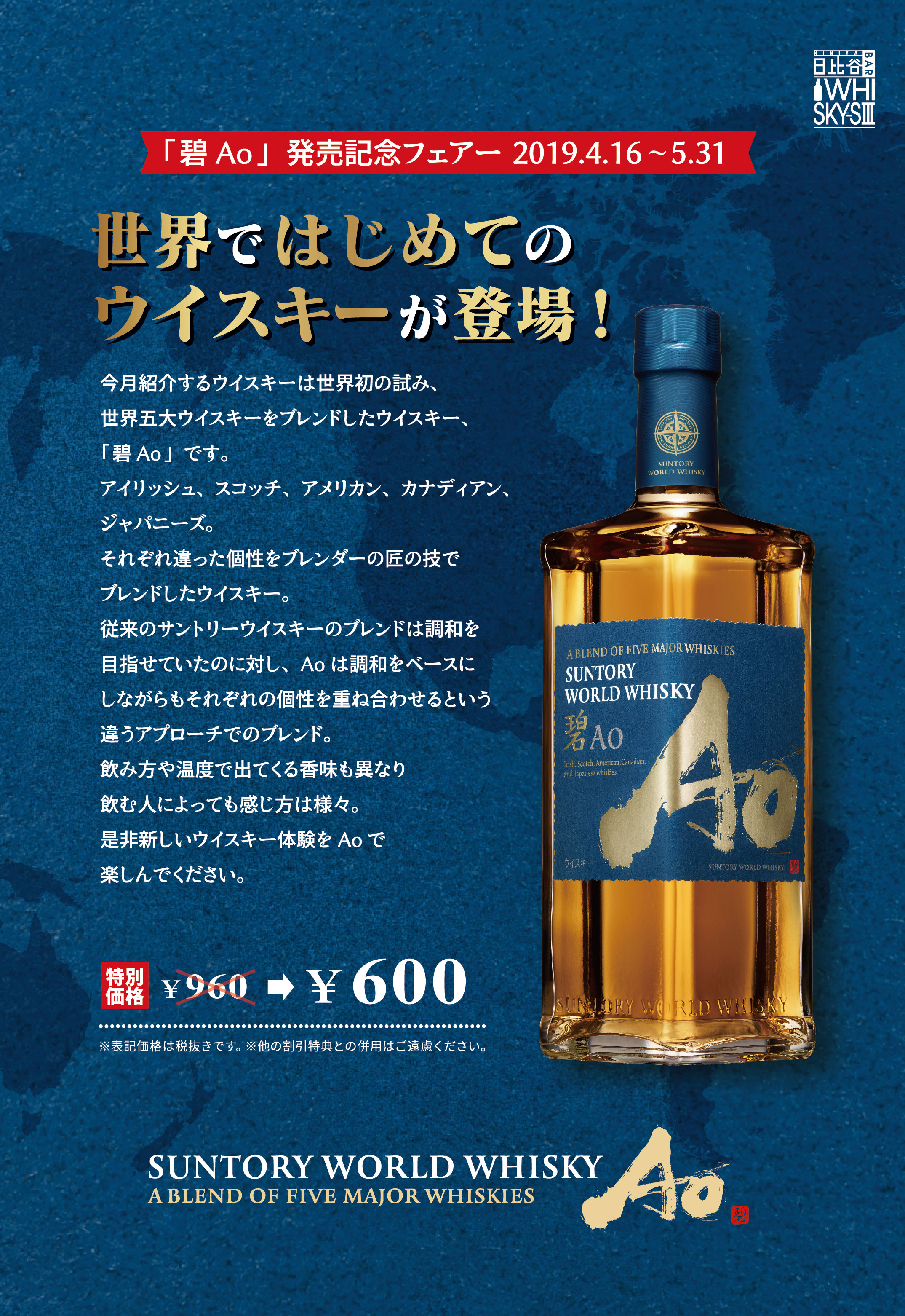 ※ 2 SUNTORY WORLD WHISKY「碧Ao」は、世界5大ウイスキー産地の自社蒸溜所でつくられた原酒のみをブレンドしてつくりあげた世界初のウイスキーです。サントリー5代目チーフブレンダー福與伸二が、ウイスキー原酒を選定し、匠の技により日本でブレンドした新しいプレミアムブレンデッドウイスキーです。1杯で世界5大ウイスキーの個性をお楽しみいただけます。