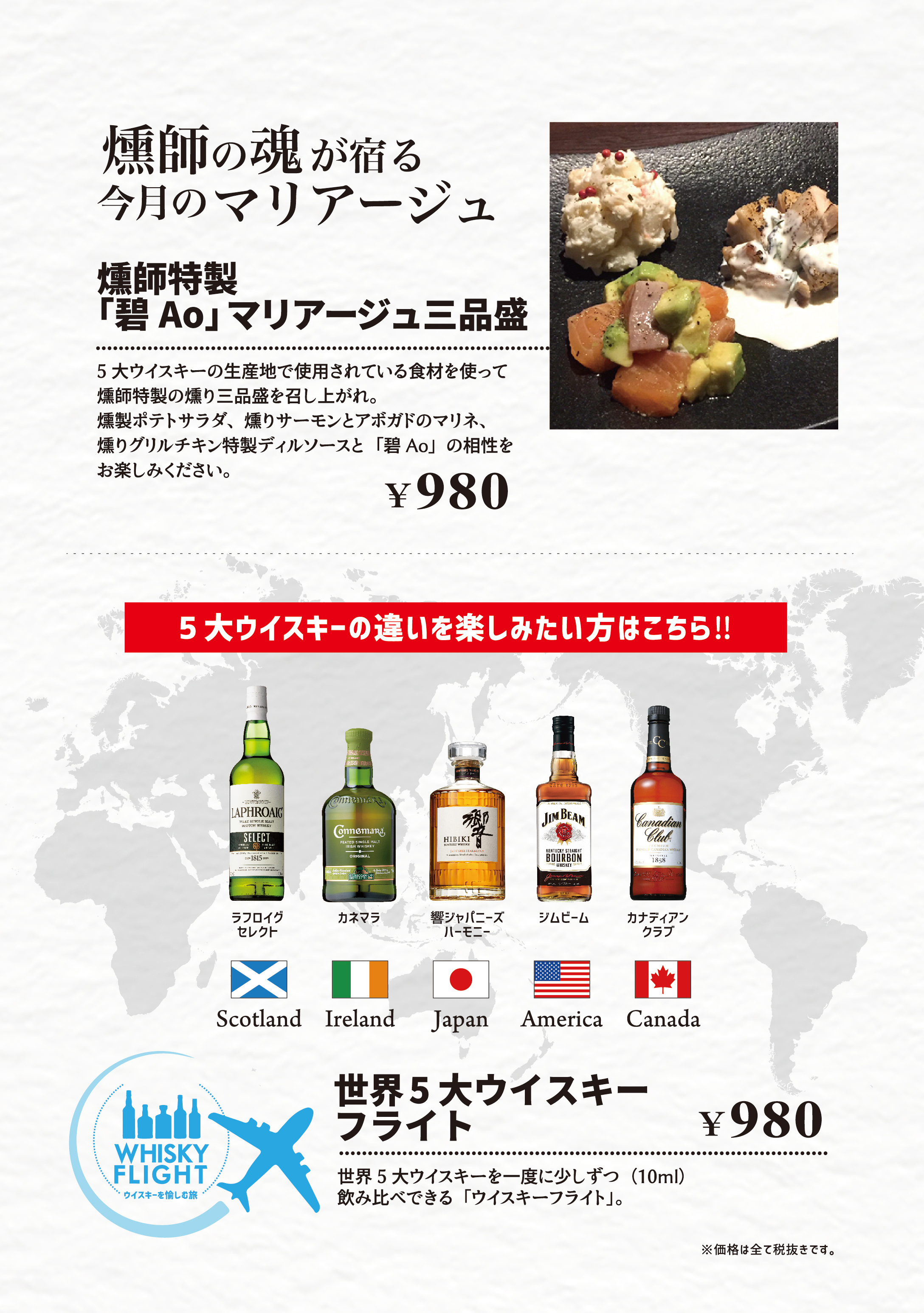期間限定メニューでは、「碧Ao」をベースにしながらもスタイルを変えることで世界五大ウイスキーの個性を引き出した5種類のハイボールや、各国を代表するスタンダードカクテルを「碧Ao」をベースにアレンジし、全く新しい味わいに仕上げた「【碧Ao】カクテル」、世界五大ウイスキーの生産地で使用されている食材を自家製の燻製器で仕上げた「【碧Ao】マリアージュフード」などを特別価格で提供いたします。