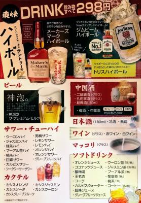 プレミアムモルツやメーカーズマークハイボール、カクテルやワインまで全て1杯298円!