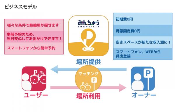 「みんちゅうSHARE-LIN」はわずかな時間から空いている土地・スペースを誰もが貸し出すことができ、誰もが借りることのできる駐輪場のシェアサービスです。スマートフォンアプリ(Android 版・iOS 版)、WEBから貸し出し、利用予約の全てを行うことが可能です。