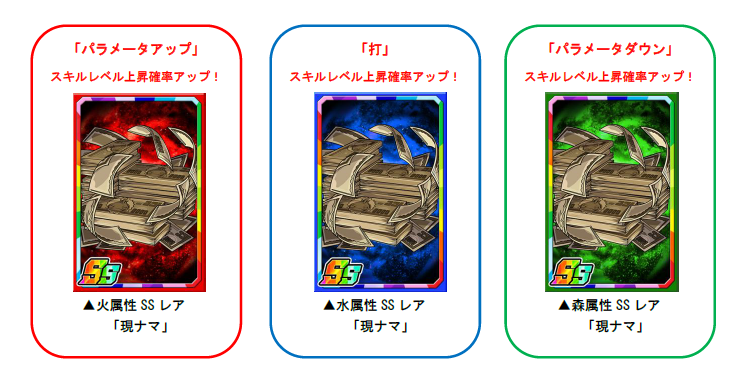 「ギャンブルP」を使い素材ガチャを回すと、限定強化素材「現ナマ」を手に入れることができます。限定強化素材「現ナマ」は一部のモンスターに使うと強化値2倍の効果があるほか、パラメータアップ・打・パラメータダウンのスキルレベル上昇確率もアップします。