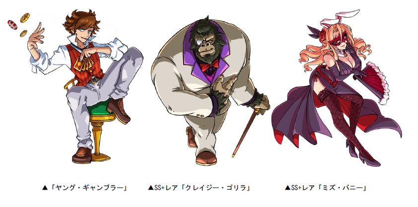 本ダンジョンには、ボスとして「ミスター・ジョーカー」「ポーカー・アリーチェ」が登場!さらに、敵として「ヤング・ギャンブラー」「ミズ・バニー」「クレイジー・ゴリラ」「ミストレス」が登場します。また、クリアした際に手に入る「ギャンブルP」を貯めると、ポイントに応じてSS+レア「ミズ・バニー」「クレイジー・ゴリラ」と交換することができます。