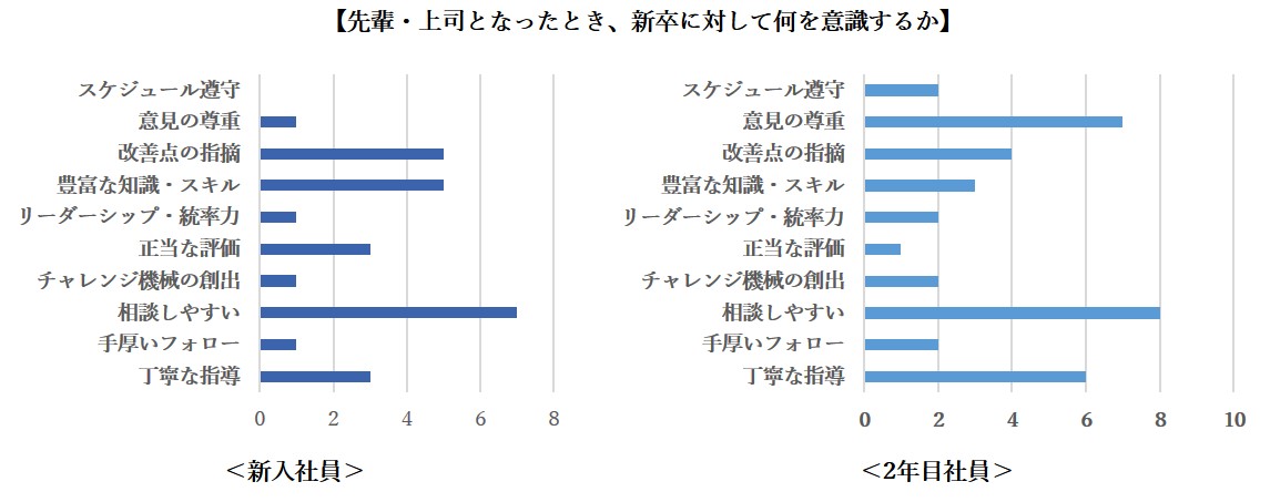 新入社員、2年目社員ともに「相談しやすい」が多い結果になりましたが、大きな違いは2年目社員に「意見の尊重」という回答が多かったことです。新入社員は改善点の指摘、知識・スキルなど「吸収したい」という意欲が結果に出ていますが、入社から1年経過した2年目社員は、自主性・主体性が育まれ、意見を持てるようになっています。