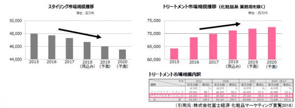 化粧品マーケティング要覧2018(株式会社富士経済、2018年6月調査)では、スタイリング市場が微減の見込みとなったのに対して、トリートメント市場は増加の見込みとなっています。
