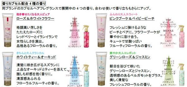 同ブランドのロングセラーであるヘアフレグランスと同じ4 種の香りで展開します。