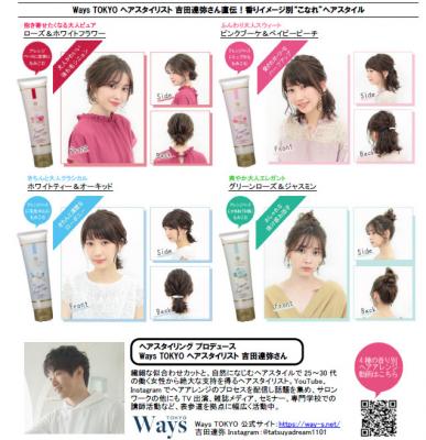 発売にあたり、20~30 代女性を中心に絶大な支持を得る表参道のヘアサロンWays TOKYO ヘアスタイリスト 吉田達弥さんに、フレグランスモイストスタイラーを使ったヘアスタイルを、香り別に4 種プロデュースして頂きました。