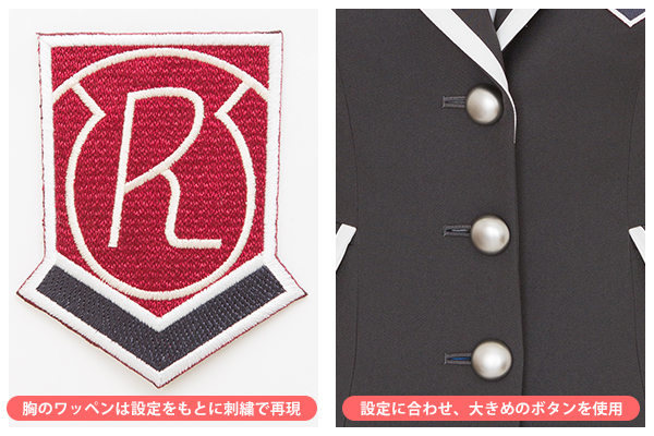 ジャケットには、設定通りに刺繍で再現した校章ワッペンつき。