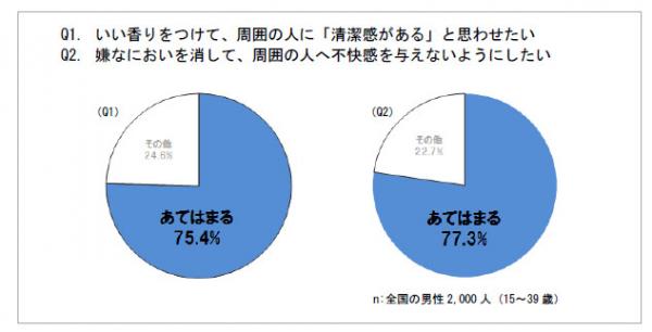 全国の男性2,000 人(15~39 歳)のうち『いい香りをつけて、周囲の人に「清潔感がある」と思わせたい』と答えたのは、75.4%(Q1)、また『嫌なにおいを消して、周囲の人へ不快感を与えないようにしたい』と答えたのは、77.3%(Q2)と共に7 割を超える結果に。