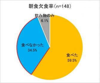 本学では、2018年10月に1年生(148名)を対象に普段の食生活について調査を実施。「調査当日に朝食を食べたかどうか」について聞いたところ、3割以上が「食べなかった」と回答。また、1週間のうち朝食回数が4回以下の学生が過半数であることも明らかになりました。