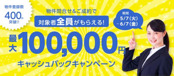 キャンペーン期間中にエネイチ経由で物件お問い合わせを頂いた方全員に、物件ご契約後に最大10万円※をキャッシュバックさせて頂きます。
