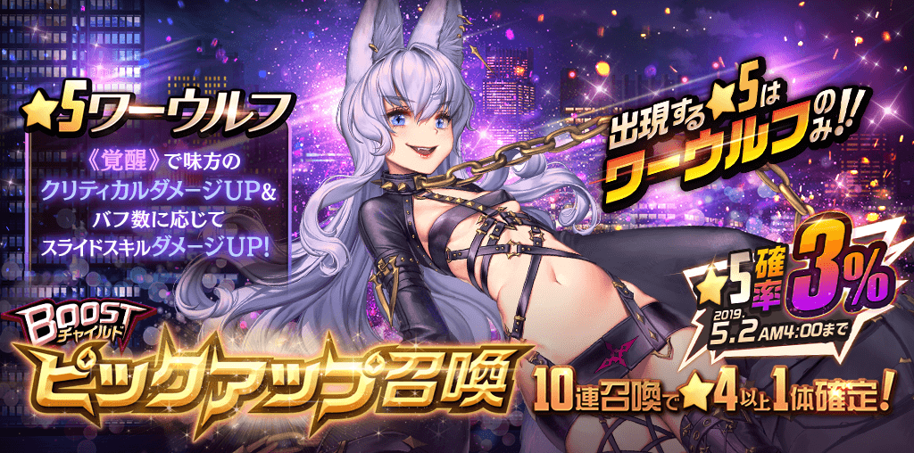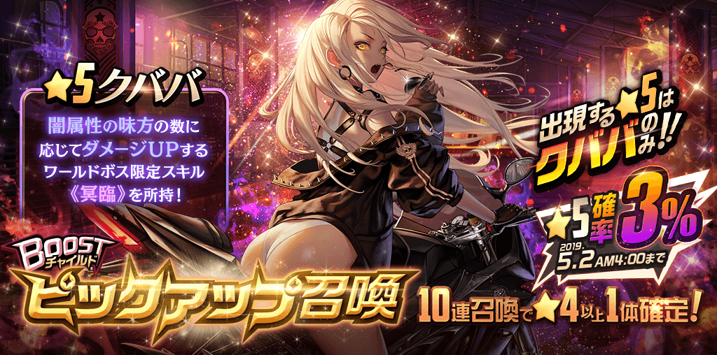 ワールドボス・トライアルのBOOSTチャイルドとなる新★5チャイルド「クババ(CV:高乃麗/清水彩香)」と★5チャイルド「ワーウルフ(CV:花守ゆみり)」をピックアップしたNight of Rebellionピックアップ召喚を開催!